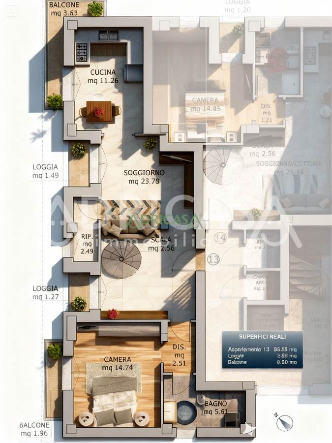 Soggiorno con accesso a due logge e a un ripostiglio e scale per accesso mansarda.