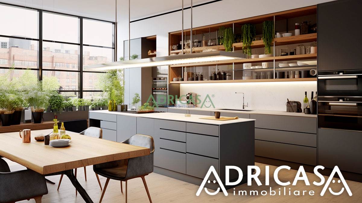 Zona Giorno: Open space moderno con soggiorno e cucina a vista, con affaccio su balcone.