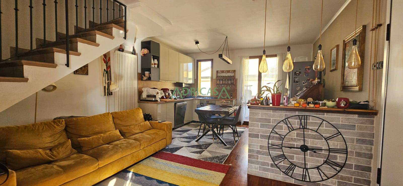 Il primo piano ospita l’appartamento principale, anch’esso con ingresso indipendente, composto da una luminosa zona giorno con cucina a vista e accesso a due balconi.